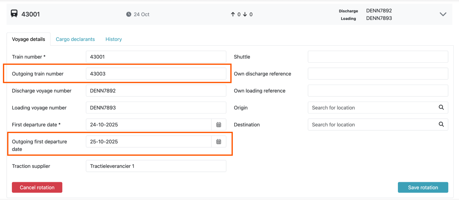 Or refer to the API Specs. Under the Create voyage endpoint, this concerns the OutgoingTrainNumber and OutgoingTrainFirstDepartureDate fields.