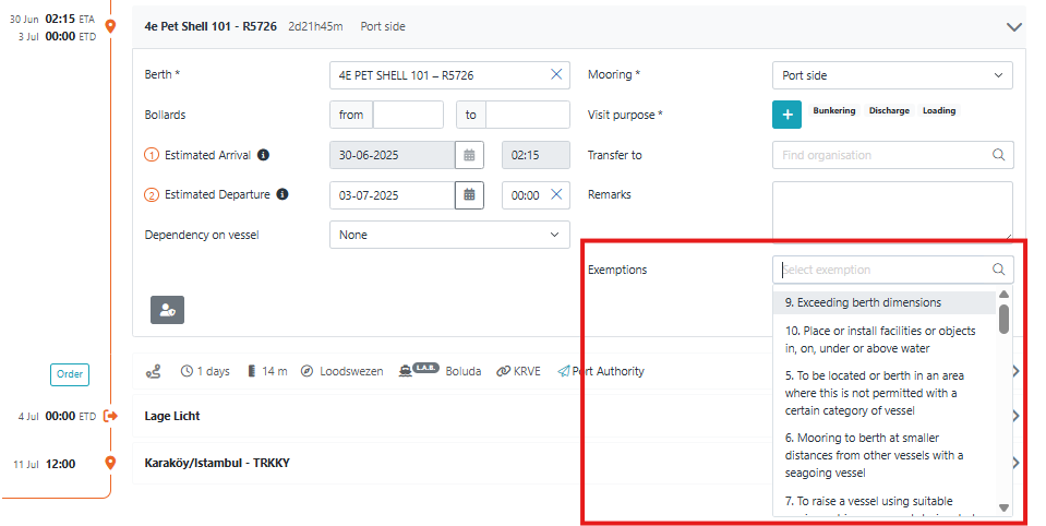 Het is mogelijk om op een ligplaats van een visit een ontheffing toe te voegen. Dit kan via een nieuw veld “Exemptions”. Het veld is een tekstveld waar de gebruiker door middel van tekstinvoer een ontheffing kan selecteren. De tekstinvoer is niet hoofdlettergevoelig en de resultaten zijn gebaseerd op een configuratie. Hierdoor kan per ligplaats worden geconfigureerd welke ontheffing kan worden aangevraagd. Zo wordt voorkomen dat een ontheffingen wordt aangevraagd op een ligplaats waar dit niet mogelijk is of juist niet nodig is. De titels van de ontheffingen zijn herschreven naar het Engels en waar nodig aangepast, hier vind je een tabel met een vergelijking tussen de oude en nieuwe benaming. Ook is er een volgnummer toegevoegd om de ontheffing herkenbaar te maken.